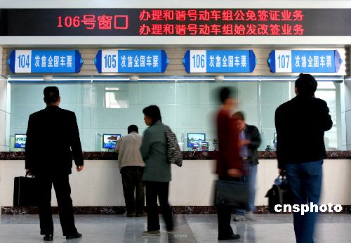 四月十四日,北京站发售第六次大提速首日开行的时速两百公里及以上动车组列车车票,颇受商务人士青睐。从十四日零时起,旅客可以购买四月十八日第六次大提速实施当天的高速动车组“D”字头列车车票。车票实行全国联网发售。中新社发 廖攀 摄