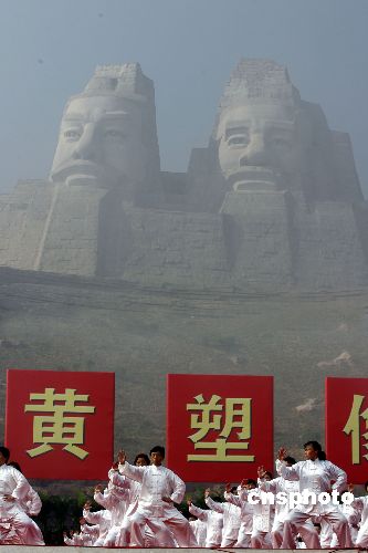四月十八日,河南郑州黄河岸边,炎黄二帝巨型塑像下的太极表演。当日,耗时二十年的炎黄二帝巨型塑像在河南郑州黄河岸边落成并举行盛大的落成典礼。炎黄二帝塑像高一百零六米,耗资一点八亿元人民币。中新社发 慎重 摄