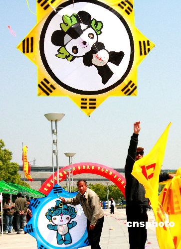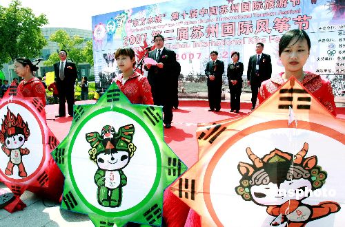 4月20日,为期3天的第二届苏州国际风筝节在苏州工业园区拉开帷幕。在以“迎五福临门,绘吴地美景”为主题的本届苏州国际风筝节中,除了有体育明星为“五福娃”风筝点睛、纸鹞韵模特秀、风筝放飞大赛外,还有旅游风情展、户外休闲运动汇展。尤其2008年奥运吉祥物“五福娃”与巨龙、“彩蝶”、“大闸蟹”等苏州水乡特色造型的风筝竞技放飞,成为本届风筝节上的一大亮点。据了解,该风筝节共邀请了中外专业风筝队20支、放飞队员200人,放飞各类风筝500多只。中新社发 苏秀 摄