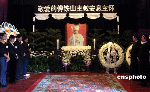 4月22日,北京宣武门天主堂为傅铁山设灵堂接受公众悼念追思。第十届全国人民代表大会常务委员会副委员长,中国国际交流协会副会长,中国天主教爱国会主席、中国天主教主教团代主席、天主教北京教区主教傅铁山,因病医治无效,于2007年4月20日20时08分在北京逝世,享年76岁。中新社发 廖攀 摄
