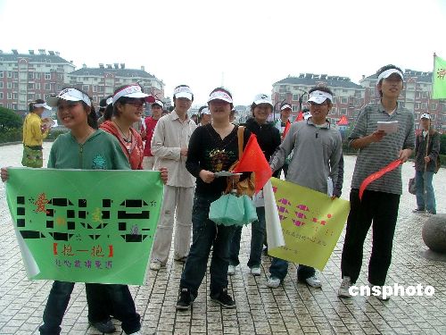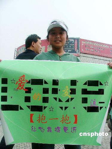 4月22日,安徽巢湖学院清音诗社40名“抱抱团”成员在街头与行人进行拥抱交流。中新社发 苏东山 摄
