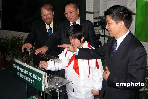 4月28日,“2007年世界夏季特殊奥林匹克运动会官方网站新版启用仪式”在上海举行。中央外宣办副主任王国庆(左二)、国际特奥会官员李·特德(左一)、2007年世界夏季特殊奥林匹克运动会组委会秘书长姚明宝(右一)和特奥小运动员,共同启动了2007年世界夏季特殊奥林匹克运动会官方网站新版。中新社发 姜煜 摄