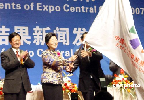 四月二十八日上午,由中国国家商务部等有关部门和中部六省联合举办的第二届中国中部投资贸易博览会在郑州落下帷幕,湖北省取得下届中博会的主办权。商务部副部长马秀红将中博会会旗转交给湖北省副省长李春明。中新社发 李志全 摄