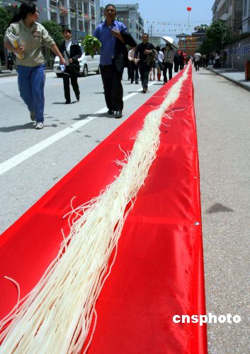 广西兴安首届“桂林米粉节”于四月三十日开幕。整个米粉节将持续七天。图为桂林一制粉世家于开幕式期间为中外游客当街展示“世界之最——三百米长米粉”。中新社发 丁竹 摄