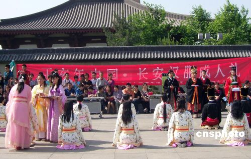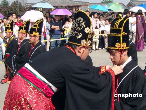 5月5日,“丁亥年中国长安汉服成人礼”仪式在西安大雁塔下举行,23名青年男女身穿汉服,按照古代礼仪分别参加了加冠加笄、受礼取字、跪拜父母等活动。中新社发 王振 摄