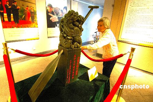 5月6日,京杭大运河保护与申遗活动的标志物——青铜“运河申遗纪念标”原件,在杭州河坊街浙江朱炳仁铜雕艺术博物馆现身。该纪念标由印玺与船桨两部分组合。其中印钮以古代玉玺为蓝本进行抽象化再创作,取其沧桑悠远,而斜穿印玺的船桨则表达了劳动者是穿越运河历史的主角。中新社发 引炜 摄