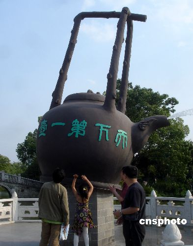 5月6日,游人在观赏巨型紫砂壶。近日,一把巨型紫砂壶亮相苏州定园,吸引了众多游人的目光。该壶为宜兴产紫砂土制成,高7.6米,用紫砂2.8吨,壶内设置人造水流系统,使水从壶嘴中喷泻而出。中新社发 王建康 摄