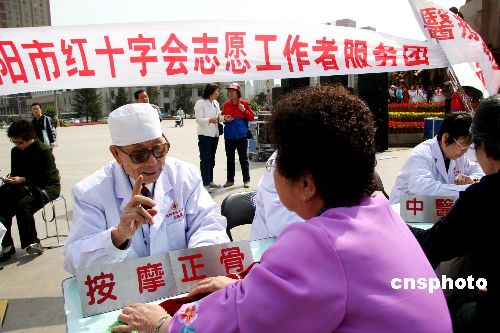 5月8日,沈阳市红十字会在沈阳中山广场举办纪念“五·八”世界红十字日活动,同时启动“博爱月”系列募捐活动。活动现场广大志愿者开展形式多样的宣传及义诊活动,同时搭建爱心平台,开展救助500名贫苦家庭先天性心脏病儿童募捐活动。中新社发 赵敬东 摄