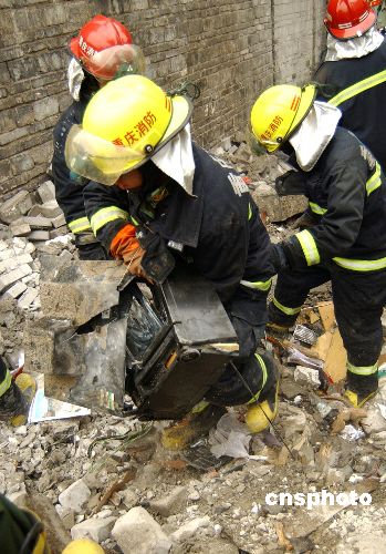 5月8日,重庆市北碚区一辆准载32吨的化危品槽车在焊接槽罐裂缝时,产生的高温使罐内甲醛残液迅速膨胀发生爆炸,当场将焊接铺的两层楼房夷为平地,方圆约50米内的建筑物不同程度震裂,同时,爆炸还造成包括电焊工在内的四名人员受伤,因抢救及时,无人员死亡。图为消防人员在事故现场紧张搜救。中新社发 万明 摄