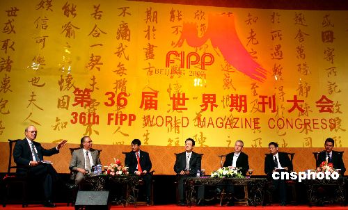5月14日,第36届世界期刊大会在北京隆重开幕。来自全球45个国家和地区的1000多位期刊出版业精英汇聚一堂,把脉世界期刊业发展态势,共同探讨期刊界所面临的挑战和机遇。图为国际期刊联盟执行主席唐纳德·库墨菲尔德先生(左一)正在大会上主持“期刊数字发展策略探讨”高峰论坛。中新社发 张勤 摄