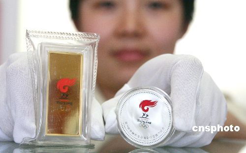 5月15日,中国金币总公司发行的“北京奥运金”彩色系列亮相河南郑州。本次发行的奥运彩金以“北京2008年奥运会火炬”为纪念主题,包括有1000克、500克、200克、100克和50克五个规格,均为成色99.99%纯金制品,正面为火炬接力标志。纪念章图案选用了火炬形象、火炬接力标志等图案。中新社发 陈代述 摄