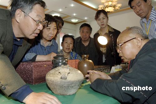 5月18日为国际博物馆日,北京市文物局组织专家在北京古代建筑博物馆内为六百余位市民进行鉴宝,不少热衷收藏的市民闻讯赶来,希望文物鉴定专家能就自己的收藏一辨真伪。中新社发 徐曦弋 摄