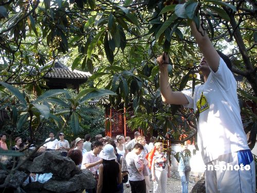 5月22日,游客在苏州拙政园枇杷园内疯狂采摘枇杷。初夏时节,拙政园枇杷园内的枇杷树上硕果累累,景观独特。可近日游客随意采摘枇杷的现象屡屡出现。中新社发 王建康 摄