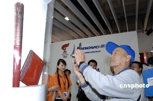 5月25日,第十届北京国际科技产业博览会的重头戏“高新技术展会”在北京国际贸易中心拉开帷幕,2008年北京奥运火炬亮相展会,引起参观市民的浓厚兴趣。中新社发 徐曦弋 摄