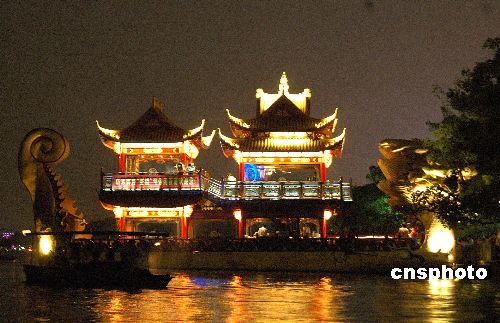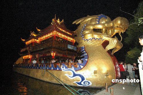 5月25日晚,杭州西湖最豪华游船“荃桡”号在湖滨二公园画舫码头启航,首次向夜游的散客开放。据传这艘有龙头的大船价值450万元,在当晚之前,它只在接待中外贵宾时才下水,平均每年下水10次左右。目前,西湖上有120条手划船,12条画舫,46艘自开船,“荃桡”号是当之无愧的老大。它仿古龙舟式样,长25米,宽8米,船栏、门窗等皆系红木打造,分上下两层。中新社发 引炜 摄