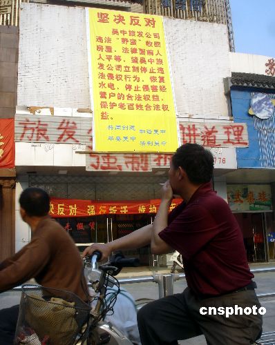 5月27日,经营户挂出的“抗议拆迁横幅和标语”引起了众多过路行人的关注。近日,在苏州市东吴北路上,一家经营户在墙上挂出了“坚决反对 强行拆迁 维护老百姓利益”的横幅和大红标语等,引起了众多过路行人的关注。据悉,由于该家经营户与建设方就拆迁具体问题未能达成一致而拒绝搬迁,建设方停止了该房屋的水电供给,造成矛盾升级。中新社发 王建康 摄