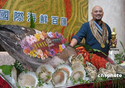 五月二十八日,刚刚在国际大赛中获得“厨神”称号的台湾名厨解惠旭,在上海“馔巴黎”海鲜餐厅展示一条重达一百五十一公斤的“巨无霸”大目鲔。解主厨还将其领衔烹饪的烤金桔鱼首、琵琶鲔鱼等十四道富有宝岛风情的“鲔鱼宴”菜肴首次引入上海,并将在每个周末为沪上饕客奉献鲔鱼“烹饪秀”现场表演。据介绍,这一台湾“鲔鱼宴”,全席价格超过人民币五千元。中新社发 许晓青 摄