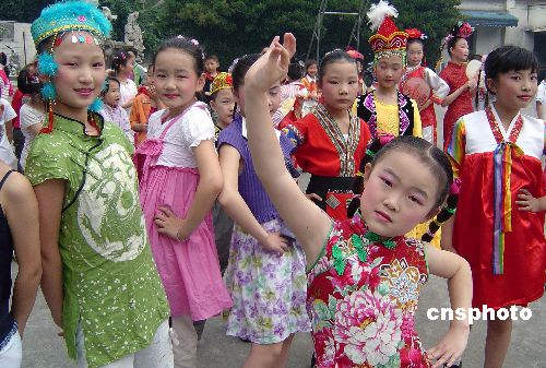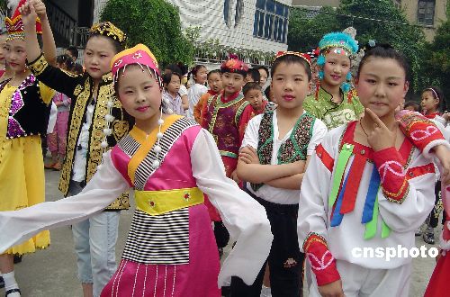 5月31日,江苏省镇江市穆源民族学校的孩子们在表演民族服装秀。当日,江苏省镇江市穆源民族学校开展了“56个民族是一家”民族服装秀展示活动,孩子们通过壮族、苗族、傣族、蒙古族等十多个民族服装的现场展示表演,表达了对祖国的热爱。中新社发 石玉成 摄