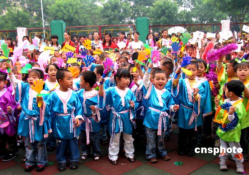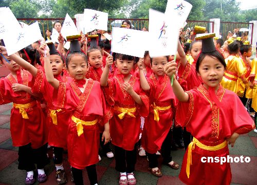 | 5月31日,秦皇岛市山海关区南园幼儿园的老师和孩子们以迎“奥运”暨汉服展演的独特方式庆祝第五十八个“六一”国际儿童节的到来。在活动现场,老师与孩子们穿上自己设计的具有浓郁汉代风情的各式服饰,尽情展示着中国古典服装服饰的韵味,弘扬传统文化。充满古风雅韵的汉代服饰,加上孩子们天真活泼的表演,使这一古老服饰显得独具魅力。与此同时,孩子们还手举着“为奥运加油”、“同一个世界,同一个梦想”等奥运标语,抒发了孩子们对奥运的期盼之情。中新社发 孙怡 摄