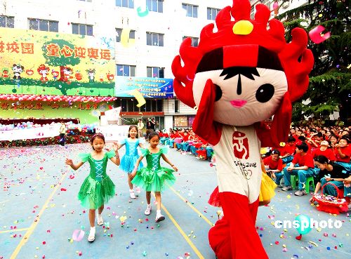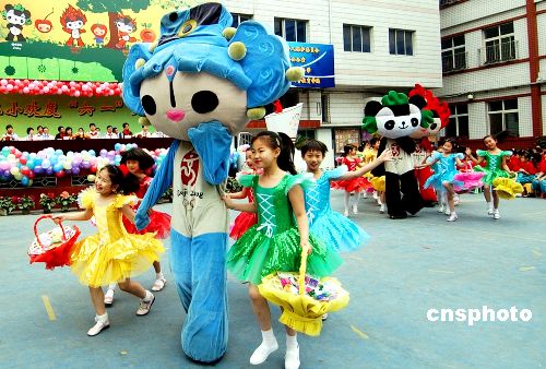 六月一日国际儿童节,北京市海淀区未成年人保护委员会在中关村第二小学举办了“福娃进校园,童心迎奥运”活动。两百余名师生一同表演了丰富多彩的节目,希望通过此次活动带动和感染身边的每一个人,为北京奥运会的举办增光添彩。中新社发 杜洋 摄
