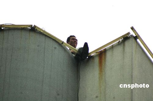 6月3日上午9点10分左右,一白衣男子爬上杭州市一医院10楼楼顶欲跳楼轻生,消防、公安部门迅速赶到劝说、营救,经劝说后男子起身放弃轻生,随后被公安部门带走。因男子情绪激动拒绝所有媒体采访,具体轻生原因还待调查。中新社发 引炜 摄