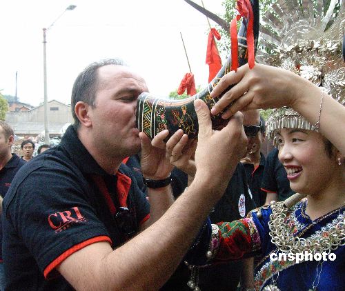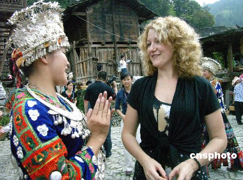| 6月3日,一名俄罗斯记者在贵州雷山郎德苗寨与苗族姑娘交谈。当日,来自俄罗斯12家主流媒体及新华社、人民日报、中央人民广播电台、中国国际广播电台4家中央媒体的记者团在黔东南苗乡侗寨对贵州民族文化进行系列采访。新闻背景:据悉,这次中俄记者团是经中俄“国家年”中方组委会批准,由国务院新闻办和国家广电总局主办、中国国际广播电台和俄通社、塔斯社承办的“中国年”活动项目“中俄友谊之旅·中国行”大型记者团跨境采访活动,中外记者团走进贵州将利于对当地民族风情进行推广。中新社发 吴东俊 摄
