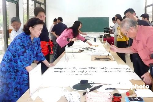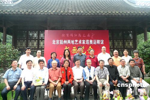 6月4日,北京、扬州的两地艺术家们齐聚江苏扬州参加书画联谊笔会。谢芳、张目、刘方亭、李嘉存、蓝天野、张金玲、刘俊京、赵昌智、陈忠南、陈社旻、杨小扬、鞠符强、徐中等艺术家参加了此次活动。笔会以“花团锦簇迎奥运 姹紫嫣红总是春”为主题。中新社发 崔佳明 摄