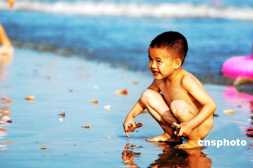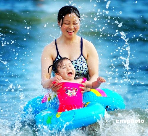6月3日,广西北海气温升至35℃,迎来当地初夏最高气温。市民纷纷带着小孩到北海银滩尽情地游泳戏水,享受惬意的清凉世界。中新社发 刘向龙 摄