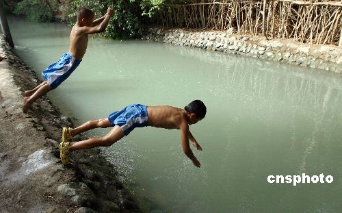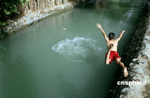 六月七日,新疆吐鲁番最高气温达到四十摄氏度,当地乡间的维吾尔族少年难耐高温折磨,纵身跳入穿越村落的河流中避暑。新疆吐鲁番地区每年高温天气达一百余天,最高气温超过五十摄氏度,地表温度高达八十摄氏度,而年降水量只有十六毫米,蒸发量却高达三千多毫米。中新社发 刘新 摄