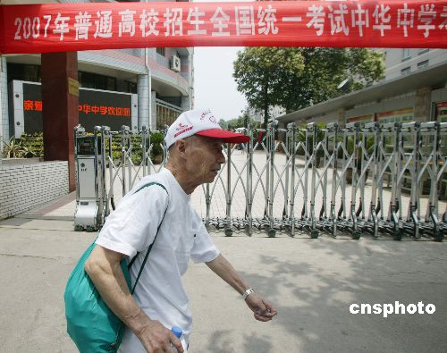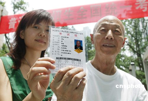 6月7日,现年78岁江苏南京市民汪侠,到南京中华中学考点参加当日语文科目的考试。汪侠于2001年和2002年参加过高考,虽然未能达到录取分数线,但成了南京医科大学的旁听生。他读完4年大学,通过了选修的49门学科课程,但因为没有学籍,不能去实习。据称,他2007年参加高考,是为圆梦,也希望将来能有资格到社区为居民无偿看病。中新社发 吴俊 摄