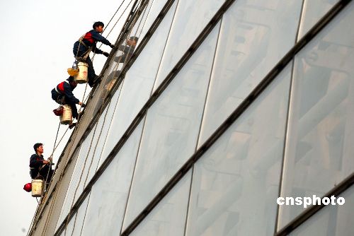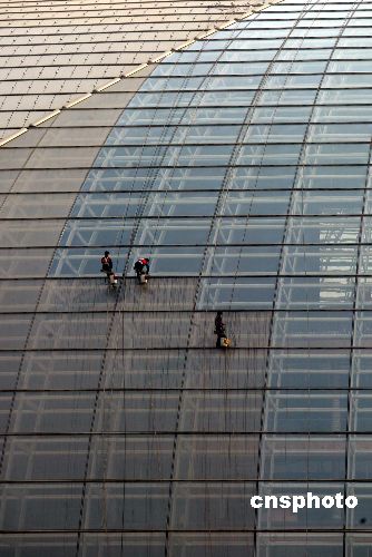六月八日,“蜘蛛人”为国家大剧院清洗外玻璃墙。国家大剧院施工进入尾声,预计将在2007年七月投入使用,国家大剧院的建成将大大改变北京文化设施不足的局面,让更多的人享受到文化艺术的熏陶。中新社发 杜洋 摄