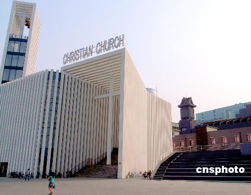 六月十日,路人从北京中关村一座新建的基督教堂前走过,该教堂地处具有强烈时代节奏感的北京中关村地区,建筑造型时尚独特,是北京西部最大的基督教堂。中新社发 廖攀 摄