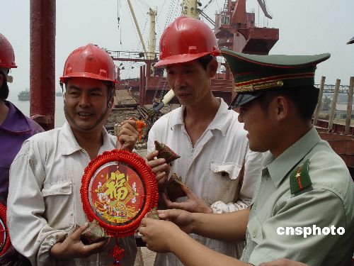 | 六月十八日武警扬州边检站监护中队官兵与停泊在扬州港巴拿马籍“丰顺号”货轮上的十一名中国船员一起包粽子,相互合影留念,整个营区都洋溢着温馨浓郁的节日气氛。图为官兵们把香喷喷的棕子和红艳艳的“中国结”赠送给船员,四十六岁的船员刘庆喜(化名)是香港人,他高兴地对记者说:“这是我第一次来到祖国的部队过端午节,边防官兵非常热情,我们就像回到了家一样,这是我有生以来过得最有意义的一个端午节。”中新社发 崔佳明 樊荣 摄