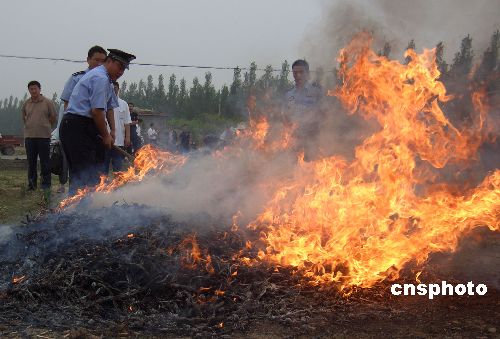6月19日,山东省枣庄市公安局市中区分局在孟庄镇举行集中销毁罂粟行动,现场公开销毁近期缴获非法种植的罂粟2900多株。中新社发 吉 喆 摄
