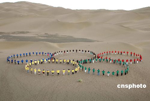 6月23日,新疆鄯善县政府和新疆登山协会联合举办“2007新疆库木塔格沙漠迎奥运千人露营大会”。来自新疆各地的千余名户外运动爱好者在库木塔格沙漠中开展徒步、爬山、奥运知识问答、摆奥运五环标志等活动,为2008年北京奥运会作宣传。中新社发 刘健 摄