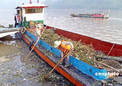 6月24日,环卫工人在长江三峡库区重庆云阳双江港码头打捞江面的垃圾漂浮物。据悉,近期三峡库区流域普降大到暴雨,长江三峡库区进入主汛期,大量来自长江支流及上游的垃圾漂浮物涌入库区,为保证长江航运和水环境安全,三峡库区各区县目前已出动多名环卫工人和多艘清漂船展开“清漂战”。中新社发 刘君凤 摄
