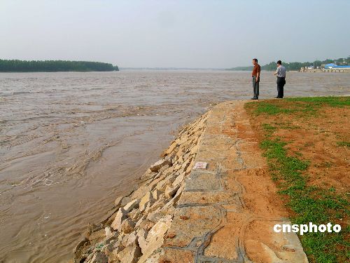 6月25日,山东黄河济南段流量增大。黄河第六次调水调沙启动以来,小浪底水库下泄流量逐步加大,当日上午,下泄流量已超过调水调沙前计划的3800立方米每秒,达到4010立方米每秒,黄河下游流量攀高,进入高水位、大流量运行阶段。中新社发 张庆民 摄
