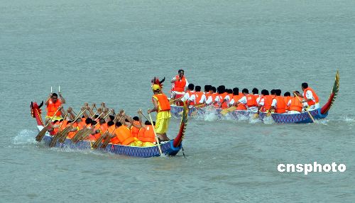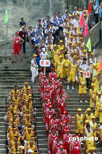 6月26日,2007年三峡龙舟邀请赛开赛,参赛的队员们排队等待比赛开始。第十二届中国重庆三峡国际旅游节将于27日在重庆市万州区正式拉开帷幕,这是该旅游节首次移师三峡库区举行。此次旅游节除保留以往节目外,还举办2007年三峡龙舟邀请赛为节会助兴,这是三峡旅游节首次增加的内容。中新社发 郭晋嘉 摄