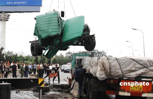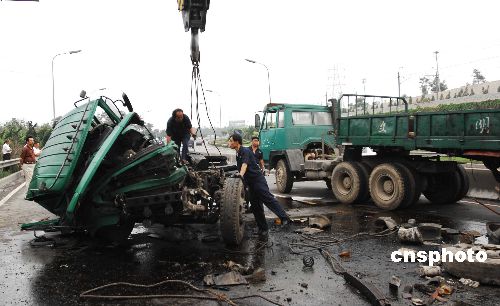 | 6月27日16时许,大连市东北快速路入市方向甘井子区石灰石矿路段,一辆10吨大货车在出市方向行驶,由于车速过快加之当时正下小雨,在驶入弯道刹车减速时,因地面路滑,直接冲向隔离带,驶入反道,撞向一辆入市行驶的三菱吉普。大货侧翻,车头面目全非。造成交通中断2小时50分钟。据交警介绍,肇事大货车负全责,司机和跟车的两人伤势不大。三菱吉普已被拖离现场,司机已送往医院,伤情不祥。中新社发 刘德斌 摄