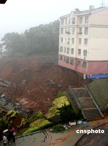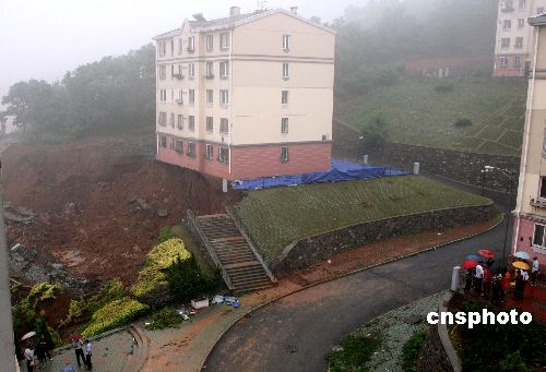 6月28日凌晨,大连市沙河口区锦霞南园22号楼南侧山体发生塌方滑坡,造成坐落坡上的10号楼地基大面积塌陷,楼体北侧近两米悬空。灾害发生后,当地有关部门立即疏散并妥善安置随时可能倒塌的10号楼和临近遭到威胁的22号楼居民,并封锁了现场,密切监视事态发展。中新社发 徐德武 摄