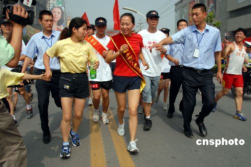 2007年7月1日上午,河南新乡市举办“迎奥运万人健步行”活动,由著名运动员、奥运冠军王军霞领跑,新乡数万人参加了慢跑和健步活动。此活动拉开了新乡市迎接2008北京奥运会活动的序幕,促进了全民健身运动的开展。中新社发 张闻 摄