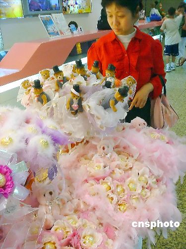 2007年7月2日,上海地铁内出售的“玩偶鲜花”。一种似花非花的“玩偶鲜花”在沪悄然流行。所谓“玩偶鲜花”,就是将花束中的鲜花用布艺玩偶代替,还有不少变种,有猫咪、小猪等玩偶,虽然其保留了花束的形状,但实际上已经变成了玩具,只是用鲜花装饰一下。中新社发 井韦 摄