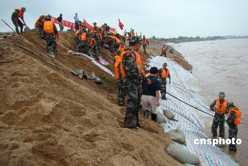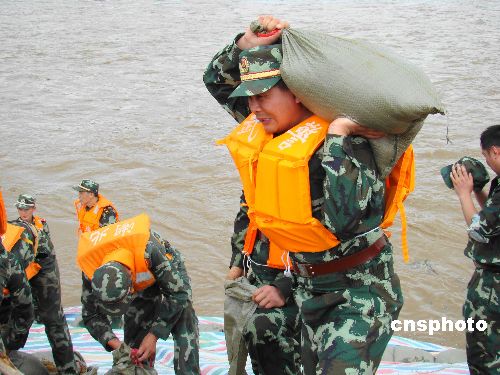 2007年7月3日,武警湖北随州市支队官兵在随州市厥水河厉山段加固河堤。据了解,厉山段河堤近日因降雨造成水流过大,发生小面积坍塌,驻地武警官兵及时赶到现场修缮、加固河堤。中新社发 宋建春 摄