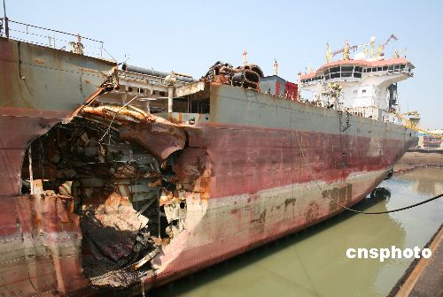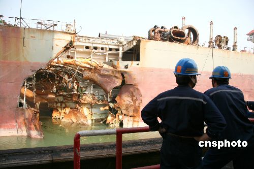 | 7月4日,荷兰籍挖泥船“奋威”号进入河北山海关船舶重工有限责任公司的大型船坞内开始为期10天的修理。“奋威”轮全长232米,宽32米,最大满载排水量82910吨,空船重量23112吨,是目前世界上最大的耙吸式挖泥船,拥有世界最先进的疏浚装备和动力定位等系统,2007年初由天津航道局租用在天津新港进行航道挖泥疏浚。3月8日,该轮在天津港外航道实施作业时,与另一艘超大型的外籍集装箱船相撞后沉没。4月11日,经交通部烟台打捞局25天的紧张施救,该轮最终脱险。中新社发 寒植 摄