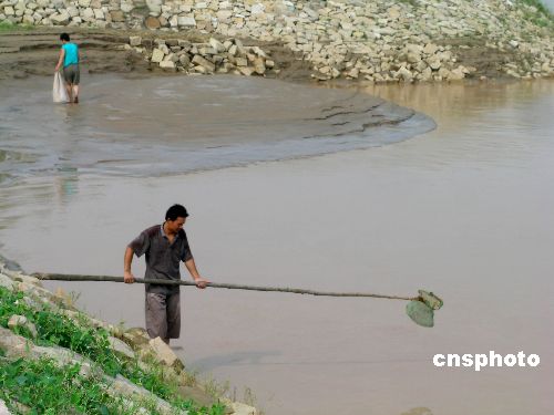 2007年7月4日,济南黄河平阴段再现“流鱼”现象,附近村民用渔具捕鱼。据悉,自6月30日10时,小浪底水库人工塑造异重流获得成功并实现高含沙排沙出库,异重流出库含沙量达97.8千克每立方米。高含沙量的河水供氧不足,导致鱼儿翻出水面,顺流而下,形成“流鱼”景观。中新社发 张庆民 摄
