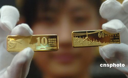 7月4日,内蒙古自治区成立60周年纪念金条、香港回归10周年纪念金条同时在北京举行首发式。前者限量发行999套,每套包含两根30克AU9999金条,共重60克,寓意内蒙古自治区成立60周年。后者限量发行1997套,寓意香港于1997年回归祖国,每套含2根25克AU9999金条。它们均由中国国家博物馆艺术品中心监制。中新社发 邹宪 摄