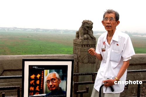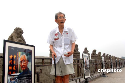 七月六日,在“七·七卢沟桥事变”七十周年纪念日来临之际,曾作为沈阳特别军事法庭检察员对日本战犯提起公诉的李放先生,在卢沟桥“为历史作证”摄影展中看见自己曾经参与审判的日本战犯高桥哲郎的照片,向众人讲述该战犯的醒悟过程。中新社发 廖攀 摄