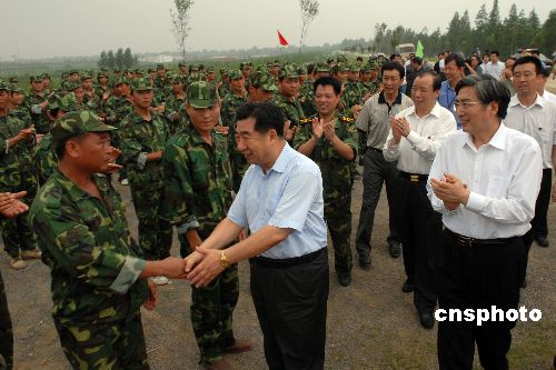 七月五日至六日,中共中央政治局委员、国务院副总理、国家防汛抗旱总指挥部总指挥回良玉来到安徽抗洪救灾第一线,察看淮河大堤防守情况,看望日夜奋战的广大干部群众和解放军、武警官兵。中新社发 张娅子 摄