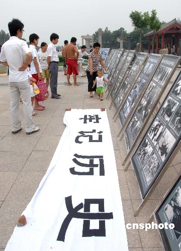七月六日,在“七·七卢沟桥事变”七十周年纪念日来临之际,众多民间纪念活动在北京西郊的卢沟桥举行,吸引市民。郑州二七纪念馆在桥畔铺设了“牢记历史 勿忘国耻”标语并设立相关图片展,“为历史作证”摄影展也在桥上举行。中新社发 廖攀 摄