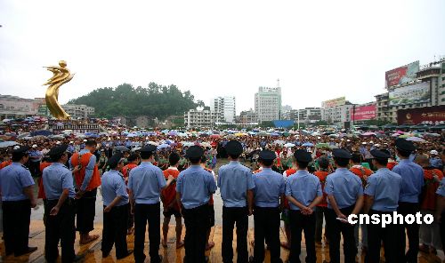 7月6日,重庆永川区公捕公判大会在渝西广场进行。会上,区公安局对涉嫌妨碍公务罪的蔡天发,涉嫌故意杀人、抢劫、贩卖毒品等犯罪的23名犯罪嫌疑人依法公开宣布逮捕;区法院对涉嫌强奸、抢劫、交通肇事、故意伤害和介绍卖淫犯罪的6名刑事被告人依法公开宣告判决。2000多名群众冒雨观看了公捕公判大会。中新社发 陈仕川 摄